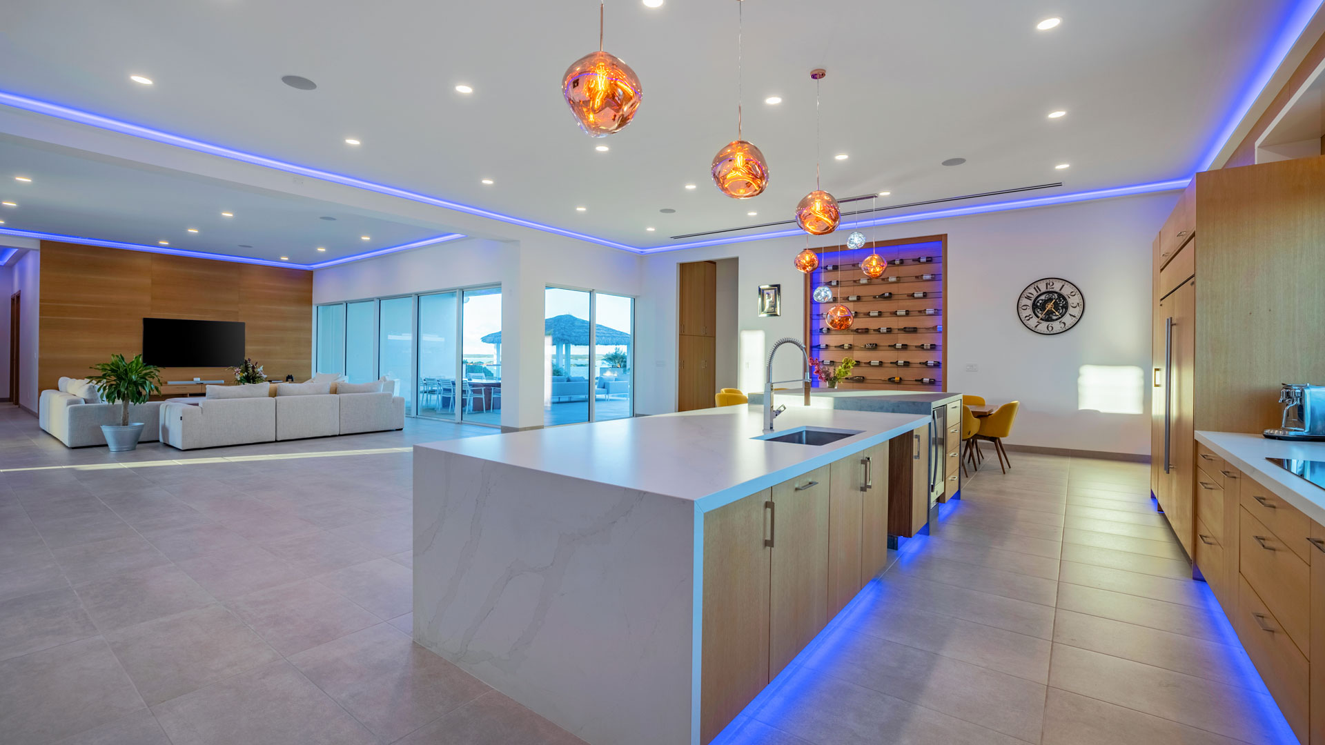 Ocean Breeze sleeps up to 12 guests in its five bedrooms and five bathrooms, ensuring ample space and comfort for a memorable stay. The fifth bedroom is equipped with two queen beds, accommodating two to four guests comfortably. This beachfront villa, situated overlooking the stunning turquoise waters of Chalk Sound, stands out as a contemporary waterfront gem. Nestled in the protected Chalk Sound National Park, renowned for its natural beauty, unforgettable sunsets, and clear tranquil waters adorned with small islands stretching into the horizon, this villa is just minutes away from the pristine Sapodilla Beach.