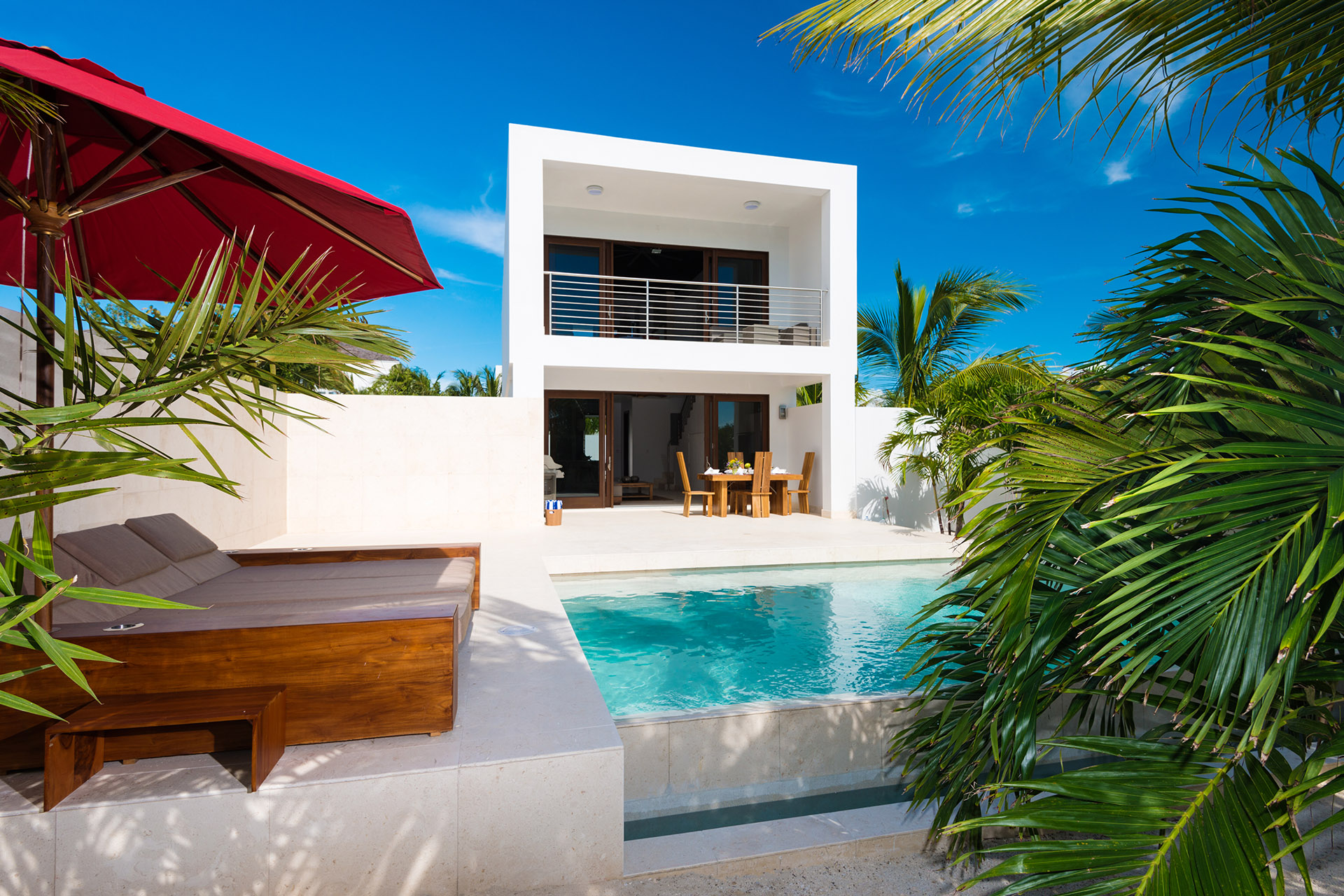 Sugar Kube Turtle Cove Villa, a lavish one-bedroom getaway situated just 100 yards from the beach. Upon entering this exclusive property, an intimate courtyard welcomes you with a private infinity pool, creating a haven of seclusion. Nestled beneath a line of swaying palms, a hammock invites relaxation.