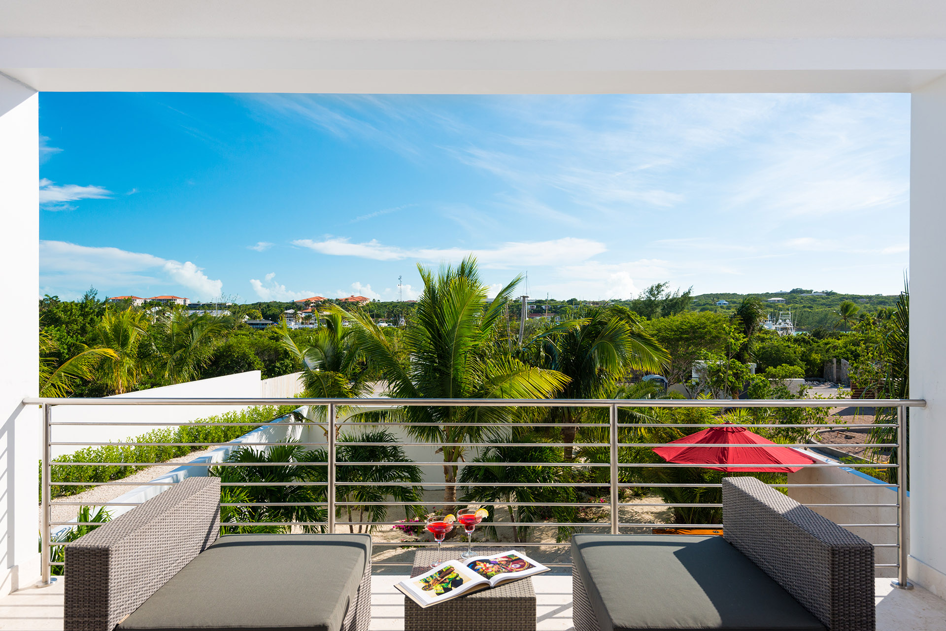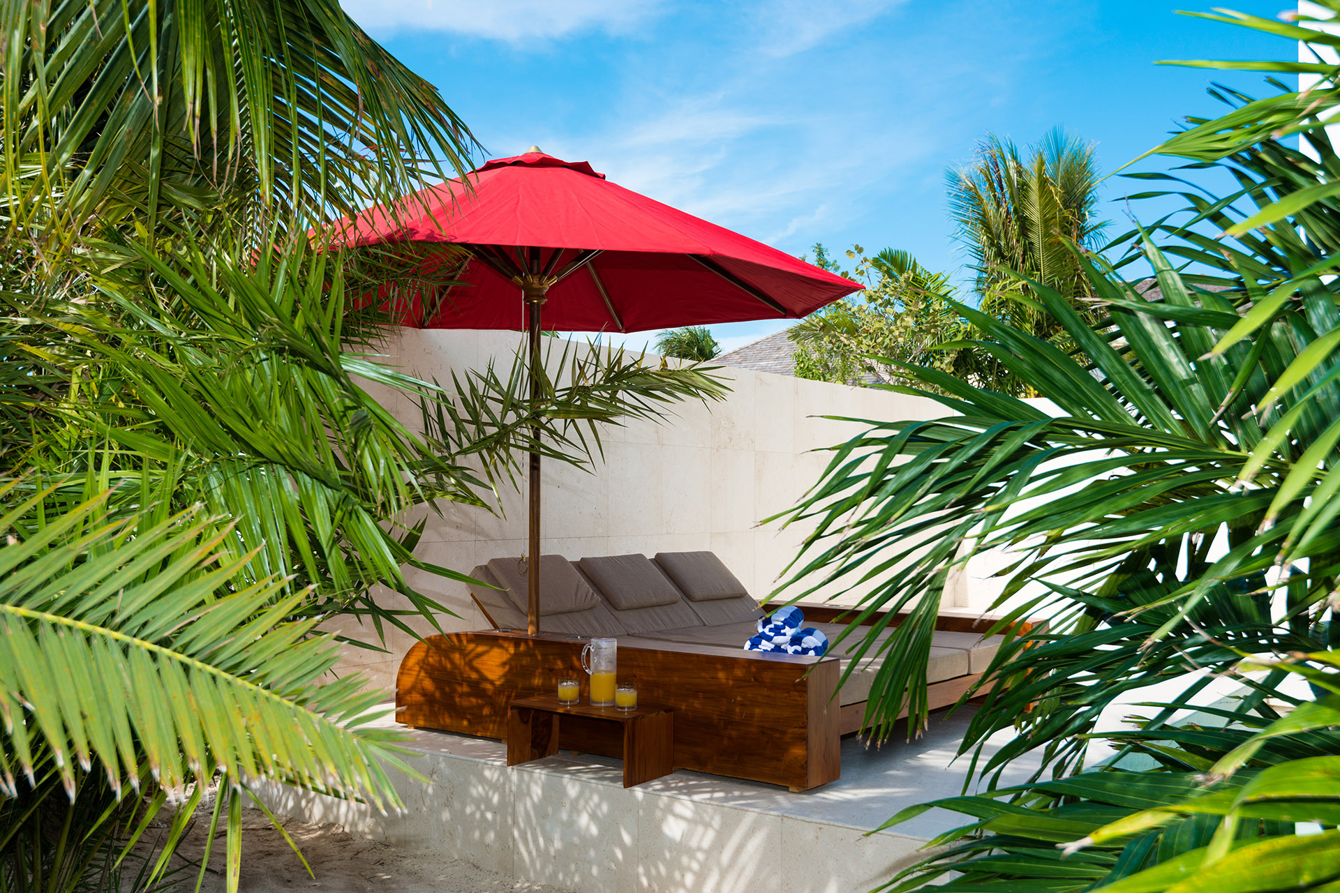 The villa’s first floor unfolds as an open-plan living area, thoughtfully adorned with polished coral stone, a seagrass rug, and vibrant accent hues that together evoke a chic modern-tropical ambience. Ascending to the upper level, you’ll discover the bedroom, a space equally open and inviting. On one side, a king bed promises restful nights, while on the other, a deep bathtub and separate shower offer a serene retreat.