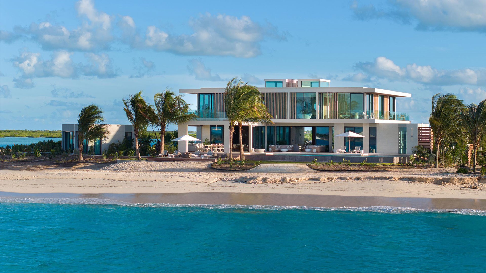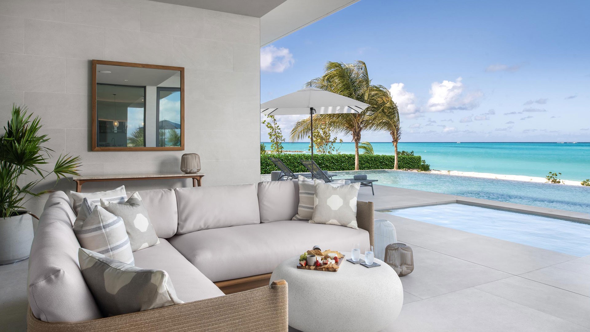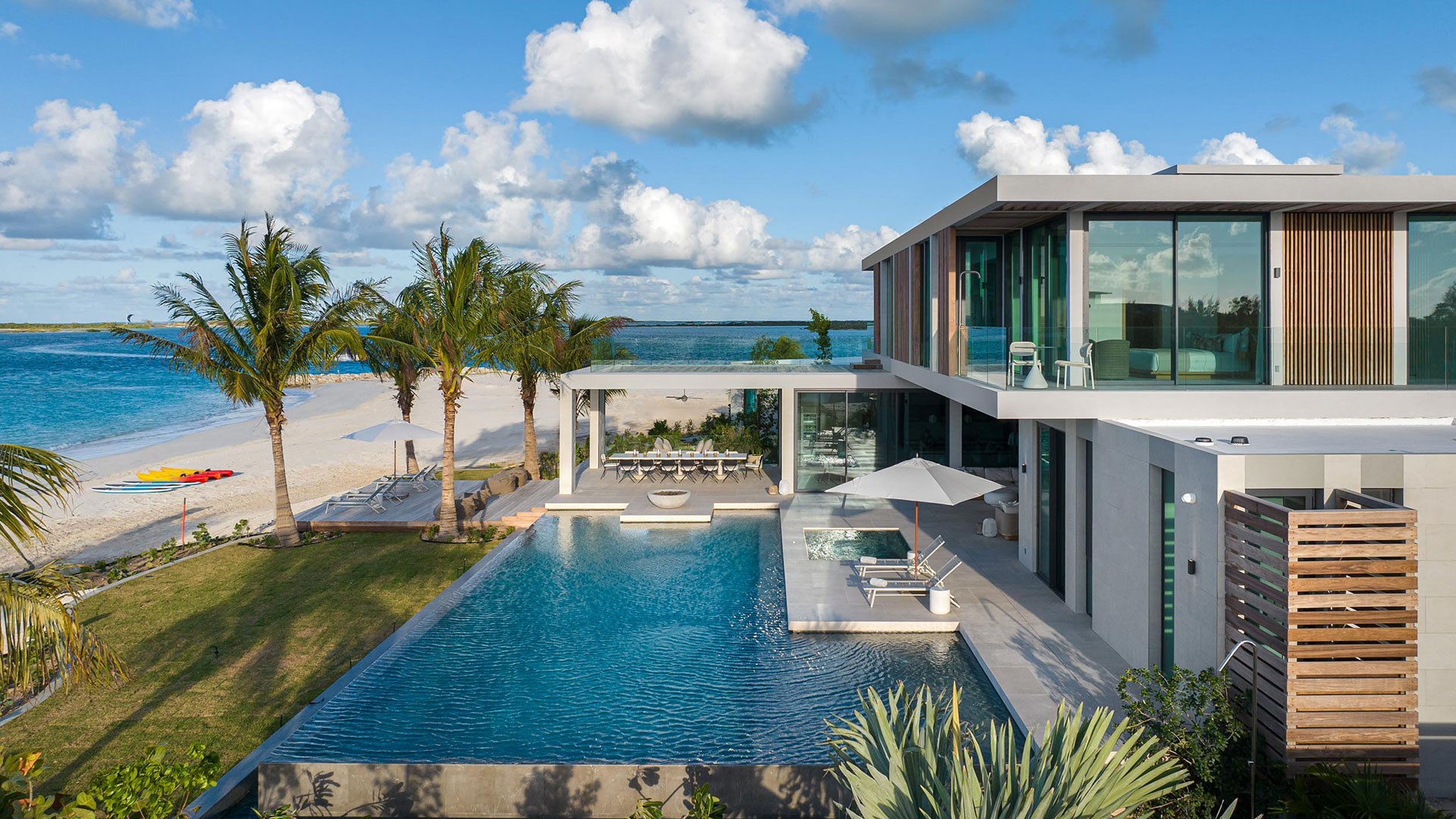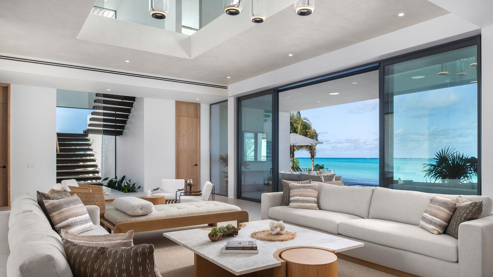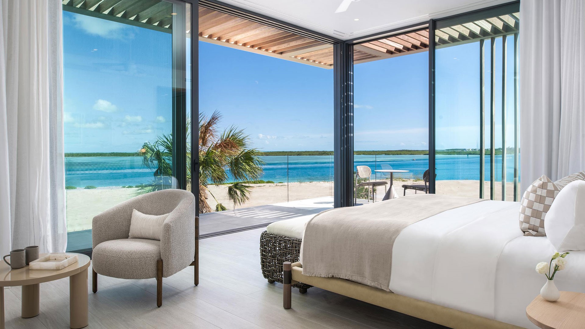 Artisanal decor, incorporating opulent wood, marble, glass, and leather finishes in soothing neutral shades, creates an immaculate and inviting ambiance. The property offers wraparound views that are unparalleled, complemented by a hot tub, direct beach access, and an expansive infinity pool — one of the largest on the islands.